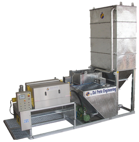 Furthermore, for greater performance, a tank for collecting the clarified water has been included within the plant, doing away with the need for an underground or external tank and allowing quick and easy sediment cleaning. Thanks to the presence of this clarified water collection tank, it was possible to provide an automatic system for replenishing the water inside the preparation tank and dosage of the flocculant. Many components, common in all other installations, are replaced in this model in order to offer ever greater reliability for the dewatering of greater amounts of sludge.